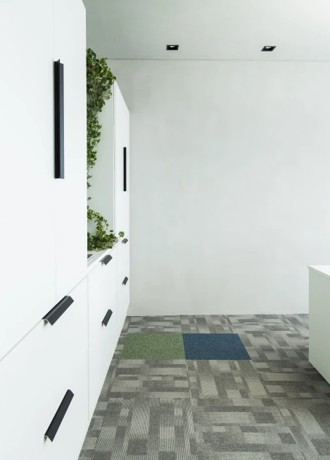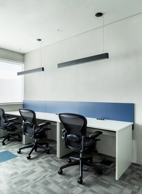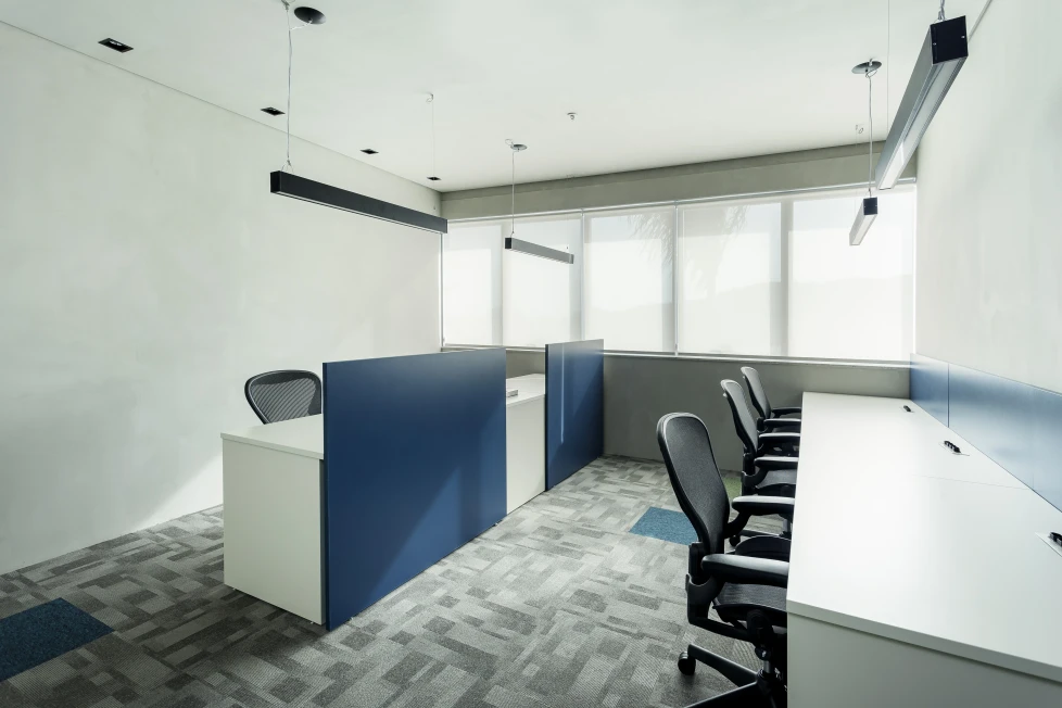 O uso de carpete nas áreas operacionais reduz a propagação sonora, enquanto o forro com manta acústica complementa a performance técnica. A marcenaria sob medida, combinada ao mobiliário modular, garante versatilidade no dia a dia, adaptando o espaço às mudanças naturais do ritmo de trabalho.