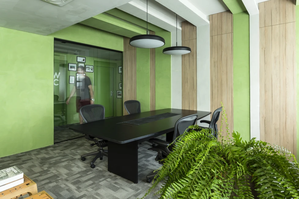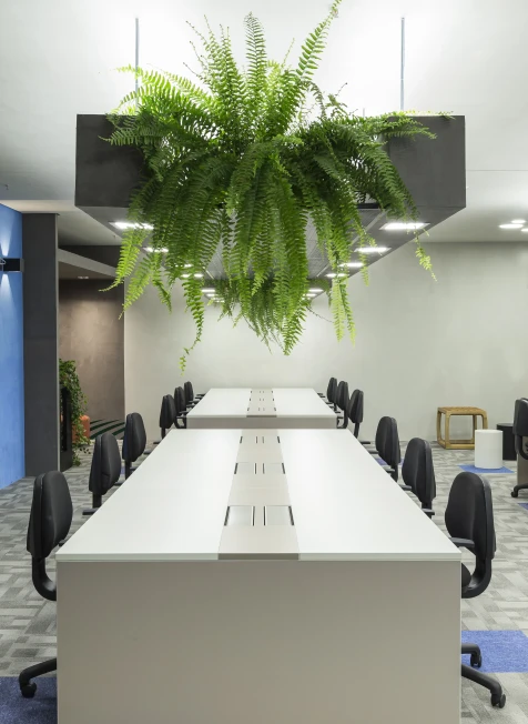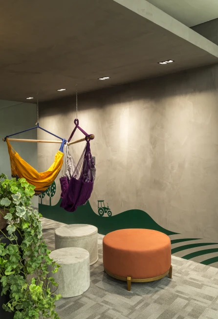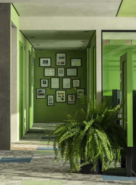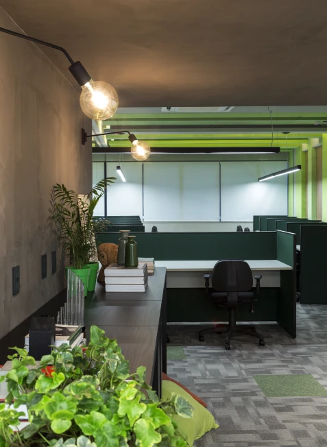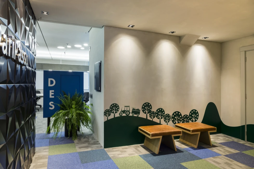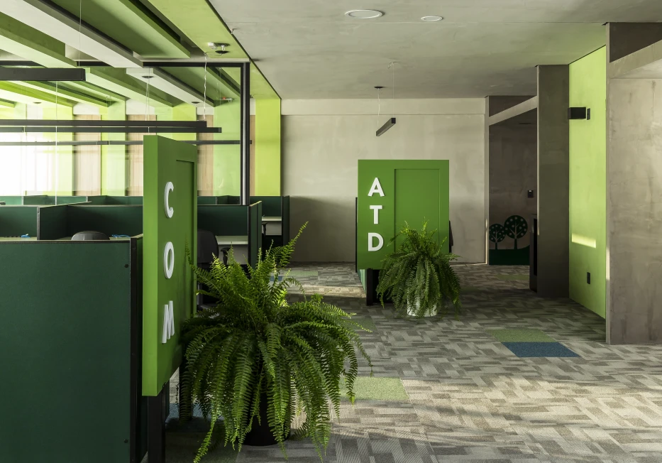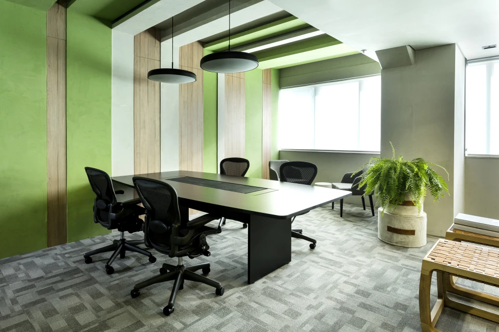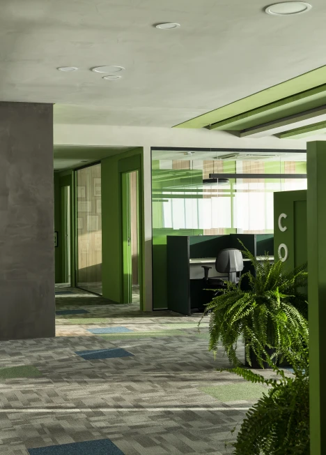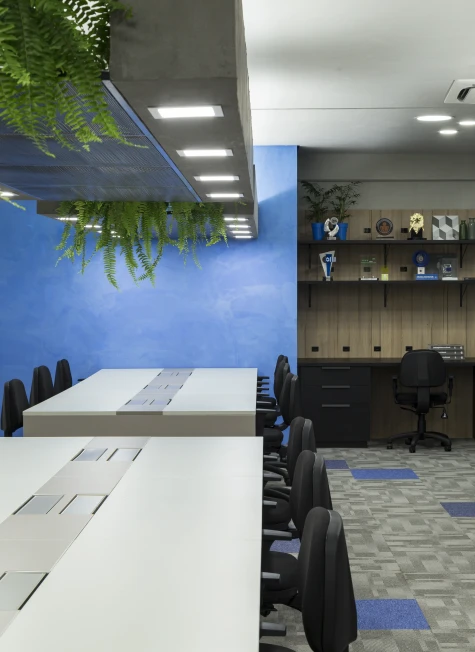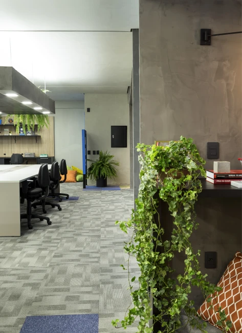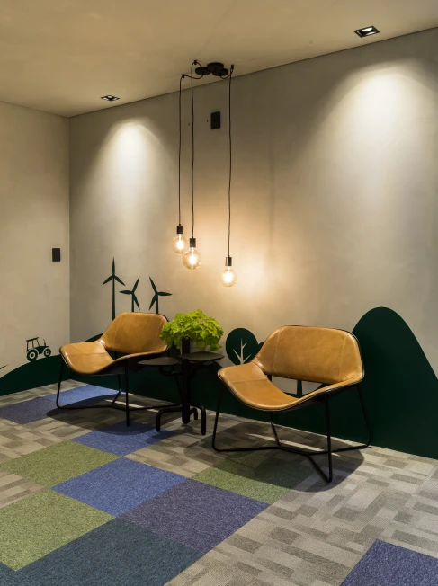 As cores institucionais foram reinterpretadas com elegância e inseridas pontualmente no projeto de interiores, fortalecendo o branding da empresa sem sobrecarregar o espaço. A vegetação e a presença de plantas cuidadosamente escolhidas estabelecem uma conexão simbólica com o setor de atuação da marca — trazendo vida, leveza e identidade para o ambiente.