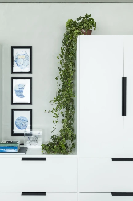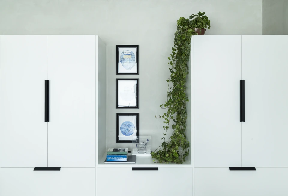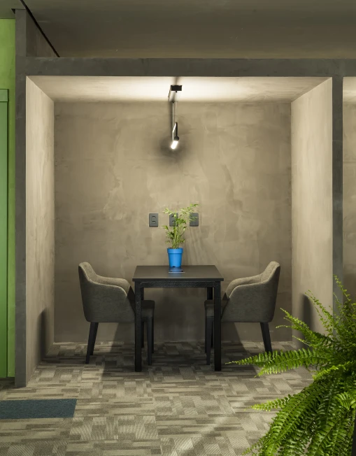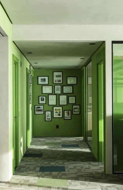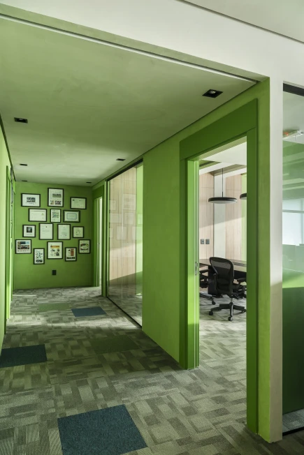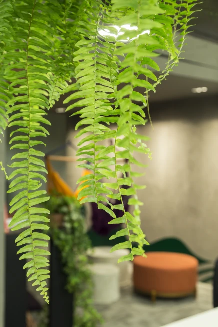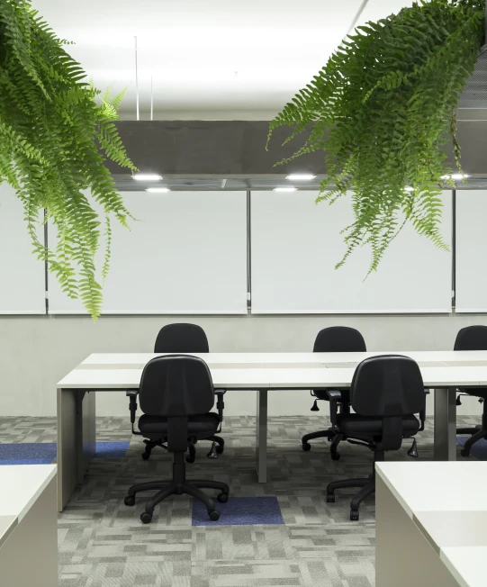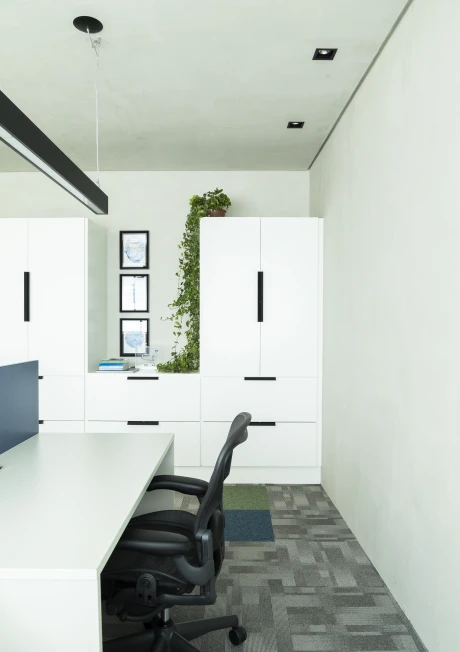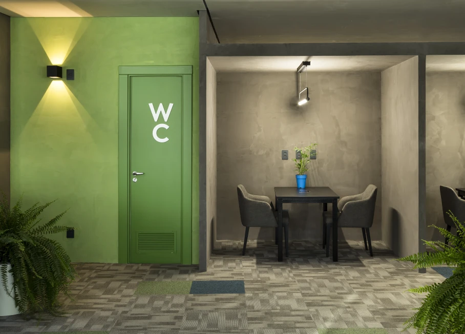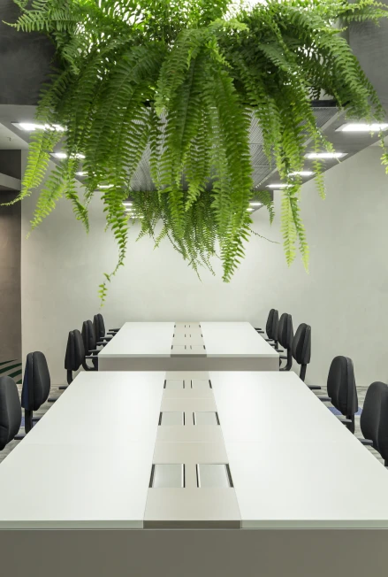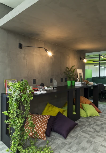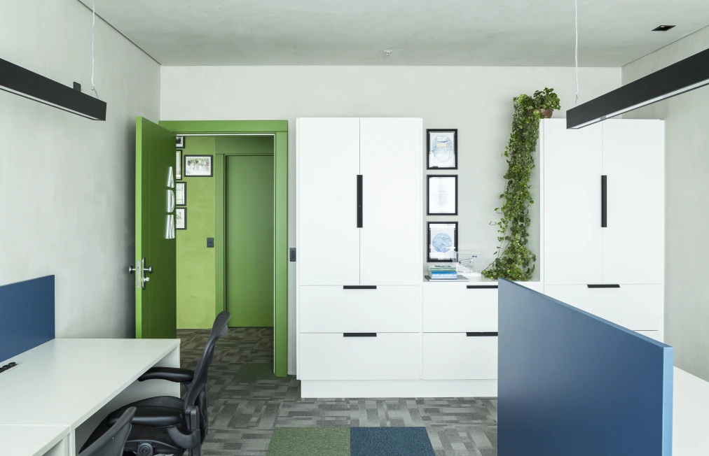 As cores institucionais foram reinterpretadas com elegância e inseridas pontualmente no projeto de interiores, fortalecendo o branding da empresa sem sobrecarregar o espaço. A vegetação e a presença de plantas cuidadosamente escolhidas estabelecem uma conexão simbólica com o setor de atuação da marca — trazendo vida, leveza e identidade para o ambiente.