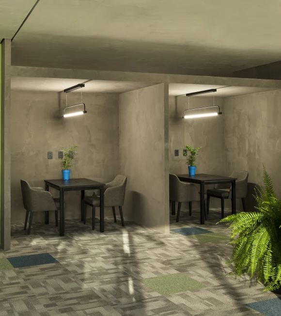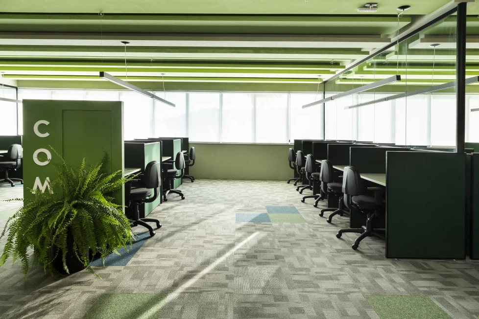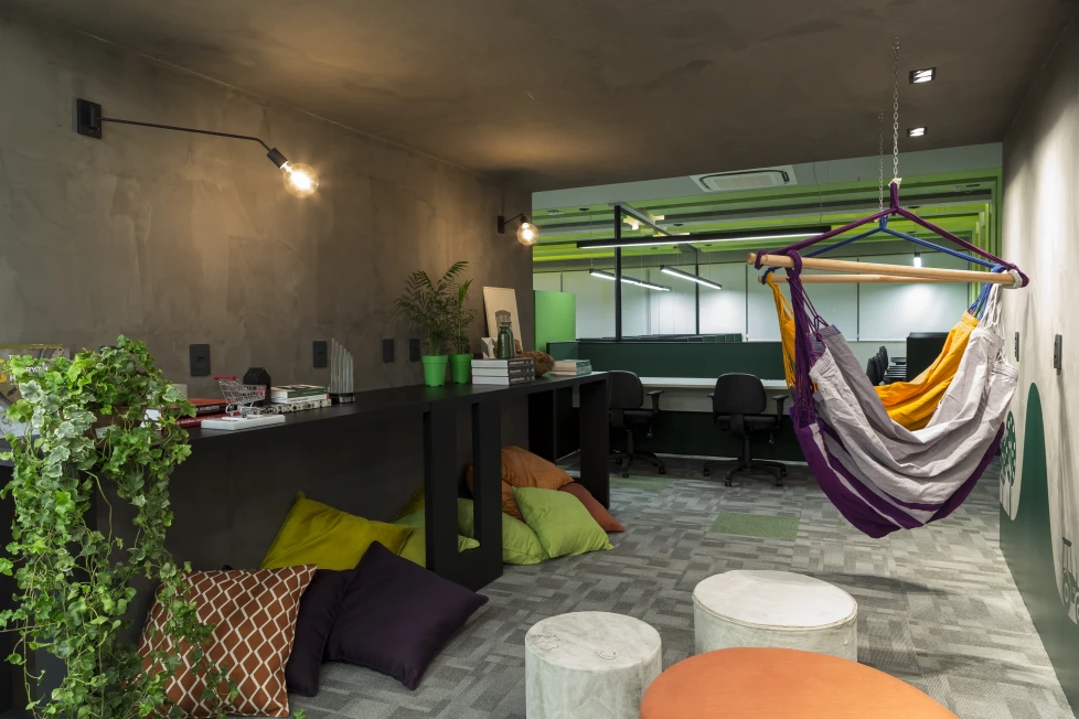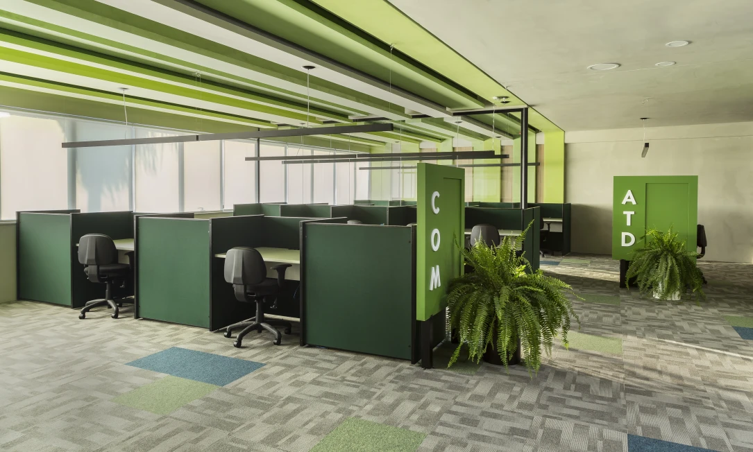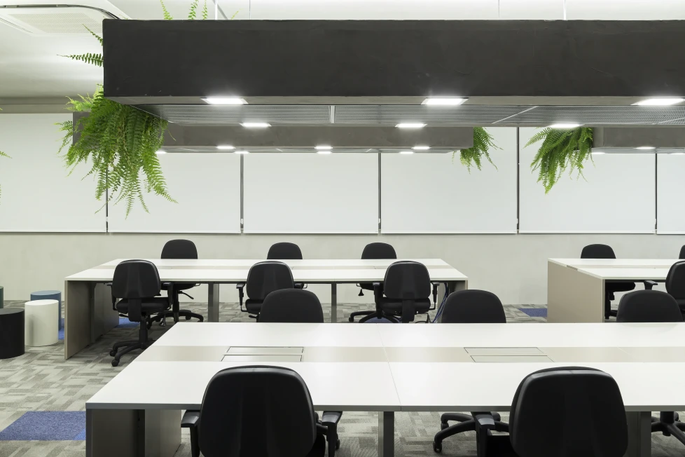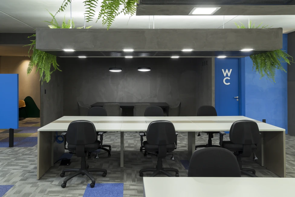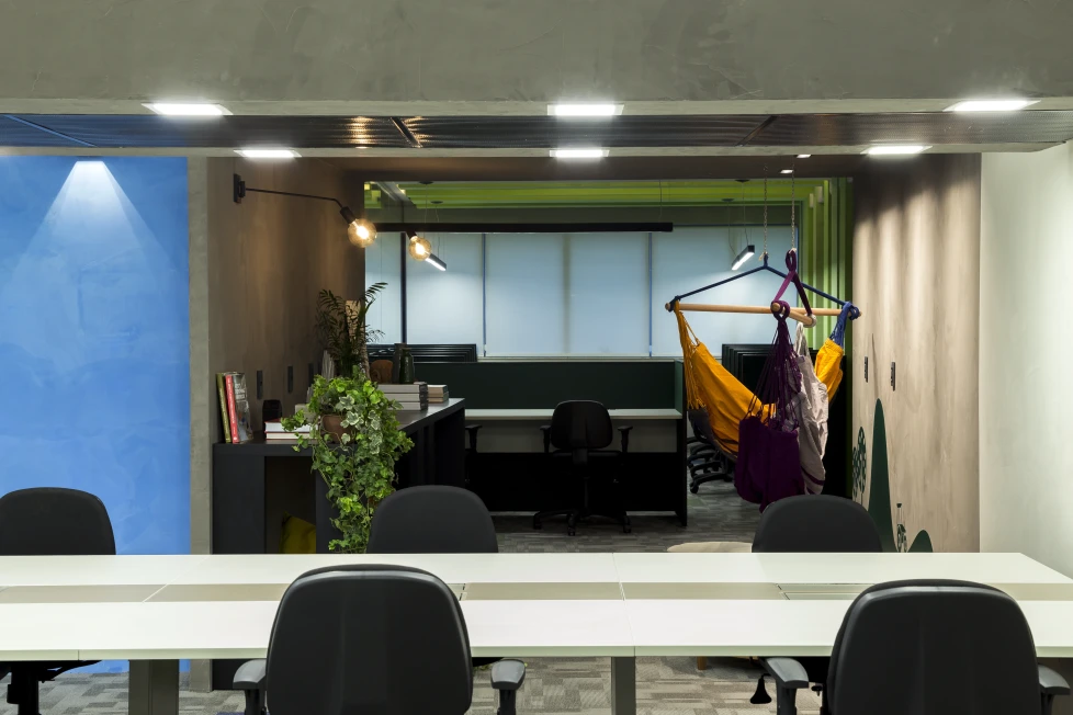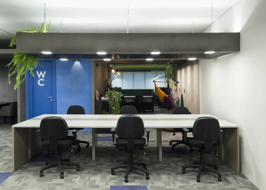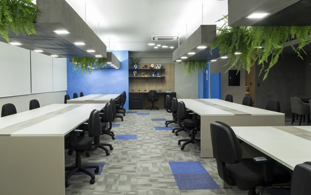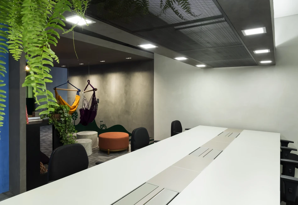 A arquitetura acompanha essa filosofia com espaços fluidos, flexíveis e integrados. Setores com maior geração de ruído, como a ala administrativa e as salas de reuniões rápidas, foram posicionados estrategicamente afastados do núcleo de desenvolvimento, assegurando foco e conforto acústico para os momentos de alta concentração.