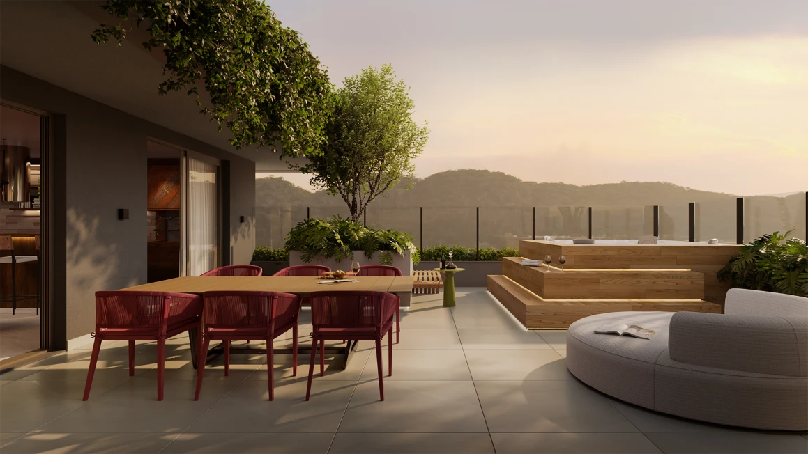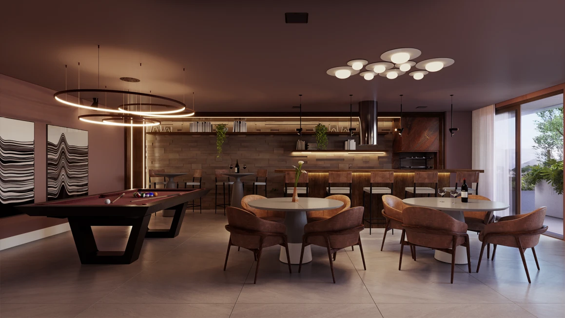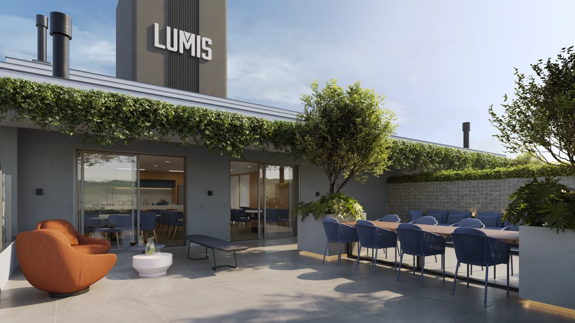 Uma curiosidade deste projeto é que a Lumis estabeleceu uma dinâmica interessante aos moradores. A torre A recebeu ambientes voltados ao wellness, como sala de yoga, sala de massagem, sauna, piscina e academia. Enquanto na torre B estão localizados os ambientes festivos, como o salão de festas e o pub, na parte central entre as torres, estão o espaço kids, coworking, mini market, halls de entrada, hub servisse e o pet place.